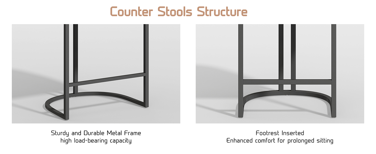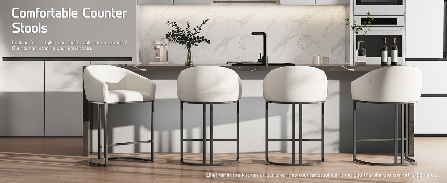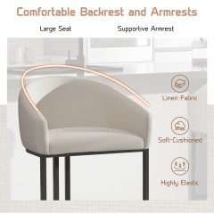 Sleek 26″ counter-height bar stools (set of 2) with modern barrel design in grey/white, linen-upholstered backs, sturdy 350-lb metal frame, non-slip pads, and easy assembly for versatile kitchen, bar, or lounge use.