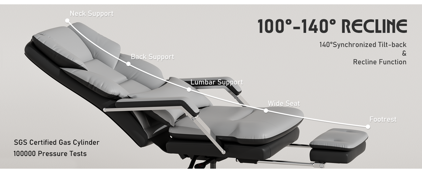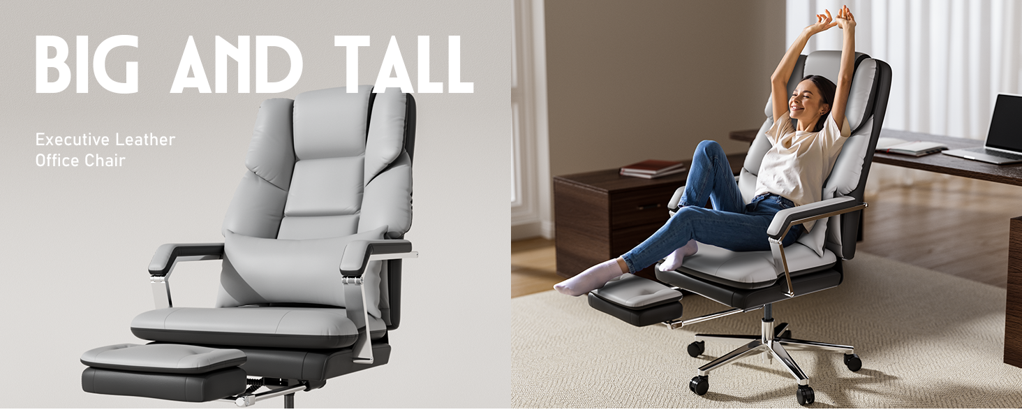 A sturdy oversized office chair for big & tall users featuring a breathable double-layered seat, 100°-140° reclining backrest with retractable footrest, adjustable lumbar support, silent 360° PU casters, and effortless 20-minute assembly for all-day comfort.