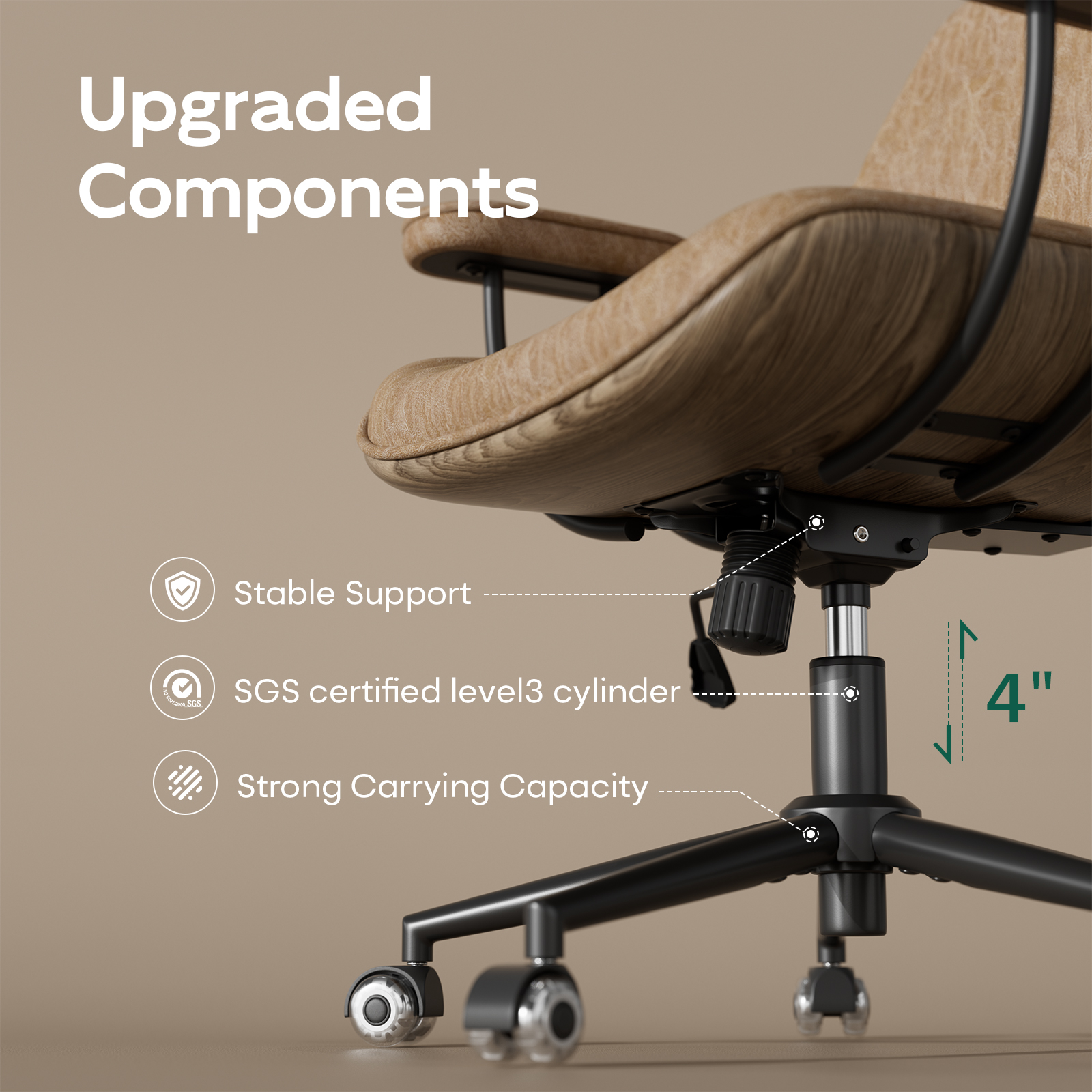 Crafted with premium scratch-resistant & stain-proof leather upholstery, reinforced by high-density foam cushioning. Built on a durable 5-star aluminum base with SGS-certified gas lift cylinder and ultra-smooth PU casters that protect floors.