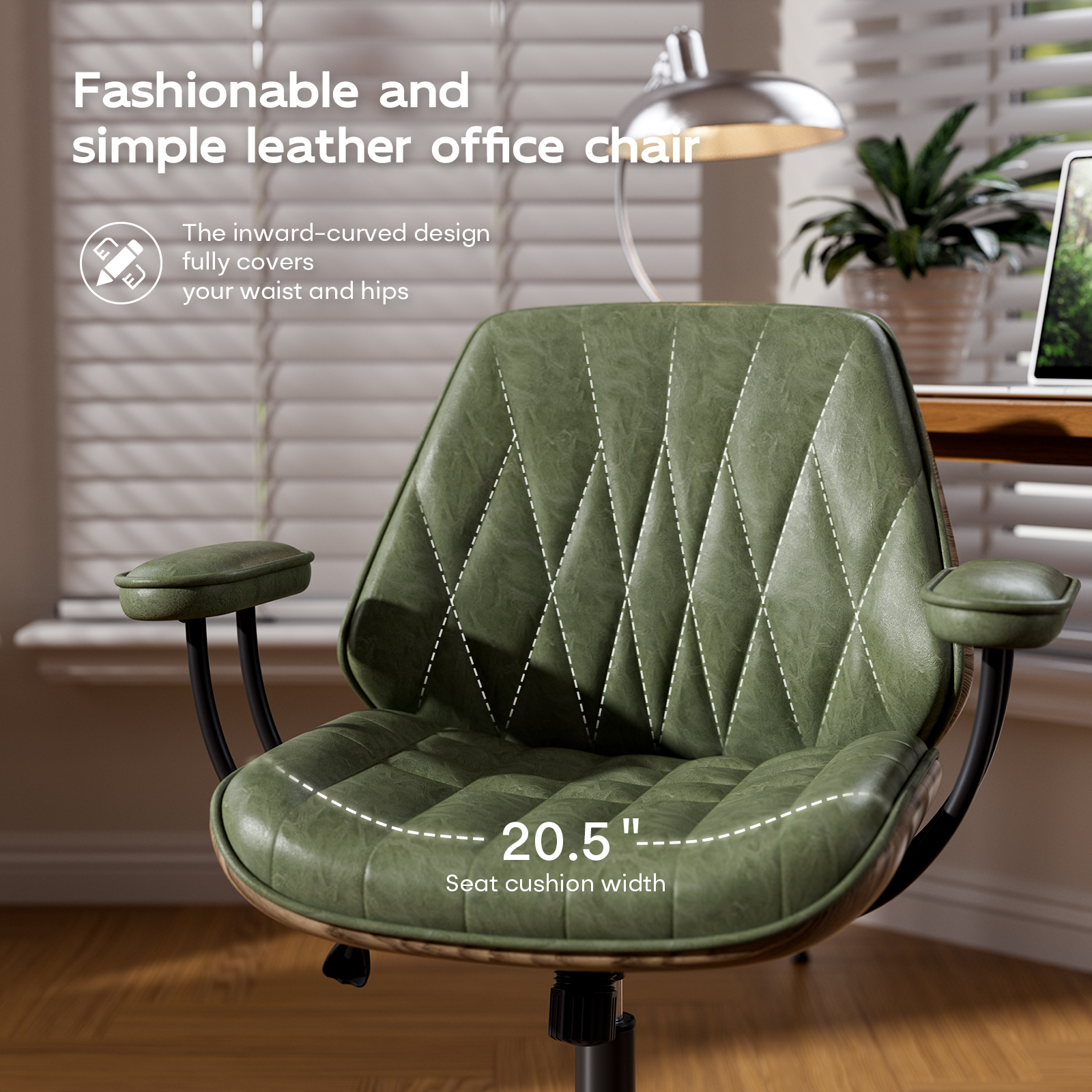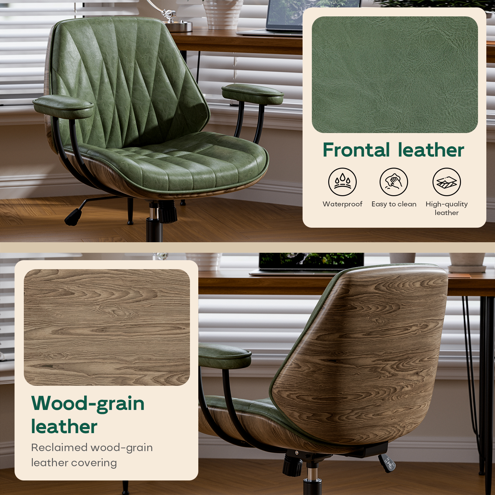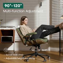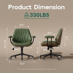 Genpo Mid Century Modern Office Desk Chair with Arms, Olive Green Faux Leather Computer Chair, Height Adjustable Vintage Swivel Task Chair for Home Office