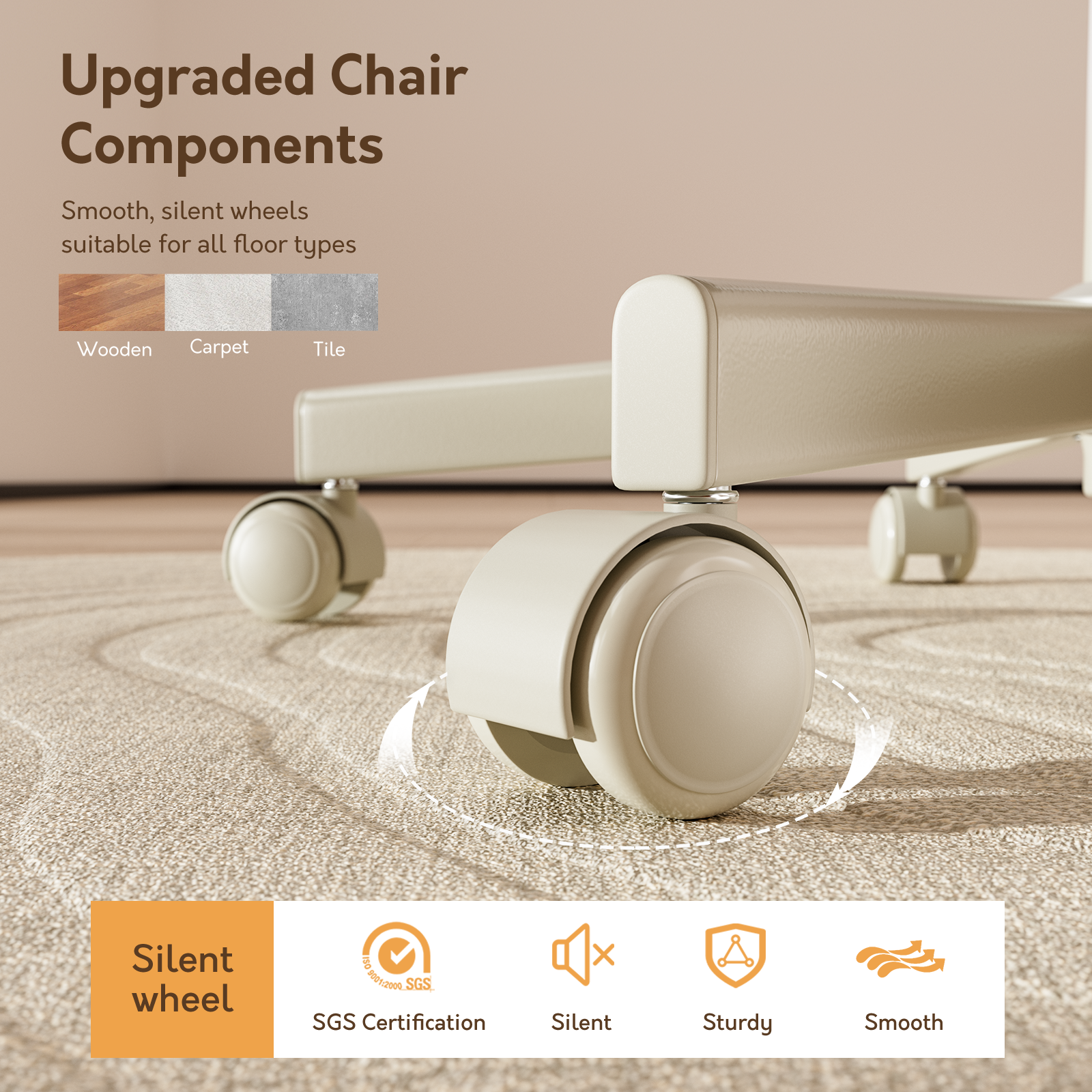 The leather desk chair (available in White/Black/Green/Brown) combines a cloud-like seat with 360° silent swivel and 17″-21″ height customization. Its smooth-rolling casters effortlessly transition between carpets and hard floors, adapting to home offices, compact bedrooms,or vanity chair stations with space-conscious ease.