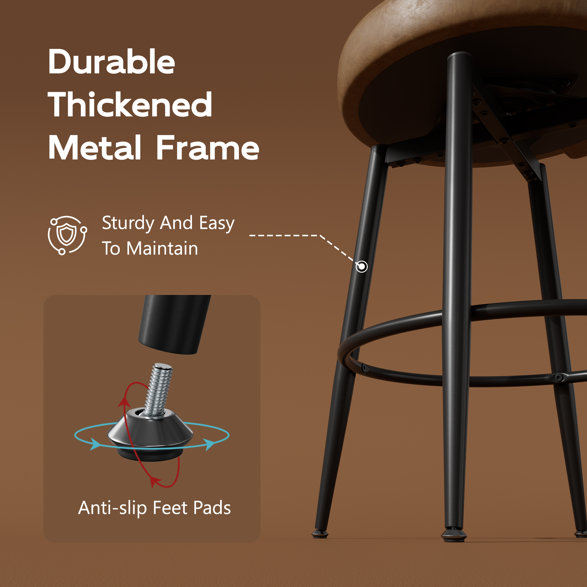 - 🍰Metal Kitchen Island Chairs: Kitchen bar stools with a sturdy metal base and anti-deformation design support up to 300 lbs; Footrest protrudes 0.8 inches for comfortable foot relaxation; Adjustable protective pads ensure stability on uneven floors