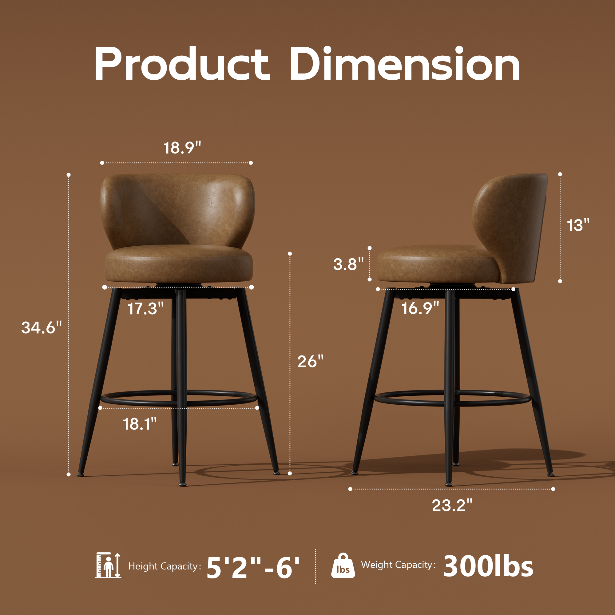 - 🌈Wider Counter Bar stools: Black bar stool set of 2 with wider seat cushion and backrest for a comfortable experience, ideal for those with a fuller figure; Overall Dimensions: 23.2 W x 23.2 D x 34.6 H inches; Seat Size: 17.3 W x 16.9 D inches; Seat Height: 26 inches; Weight Capacity: 300 lbs