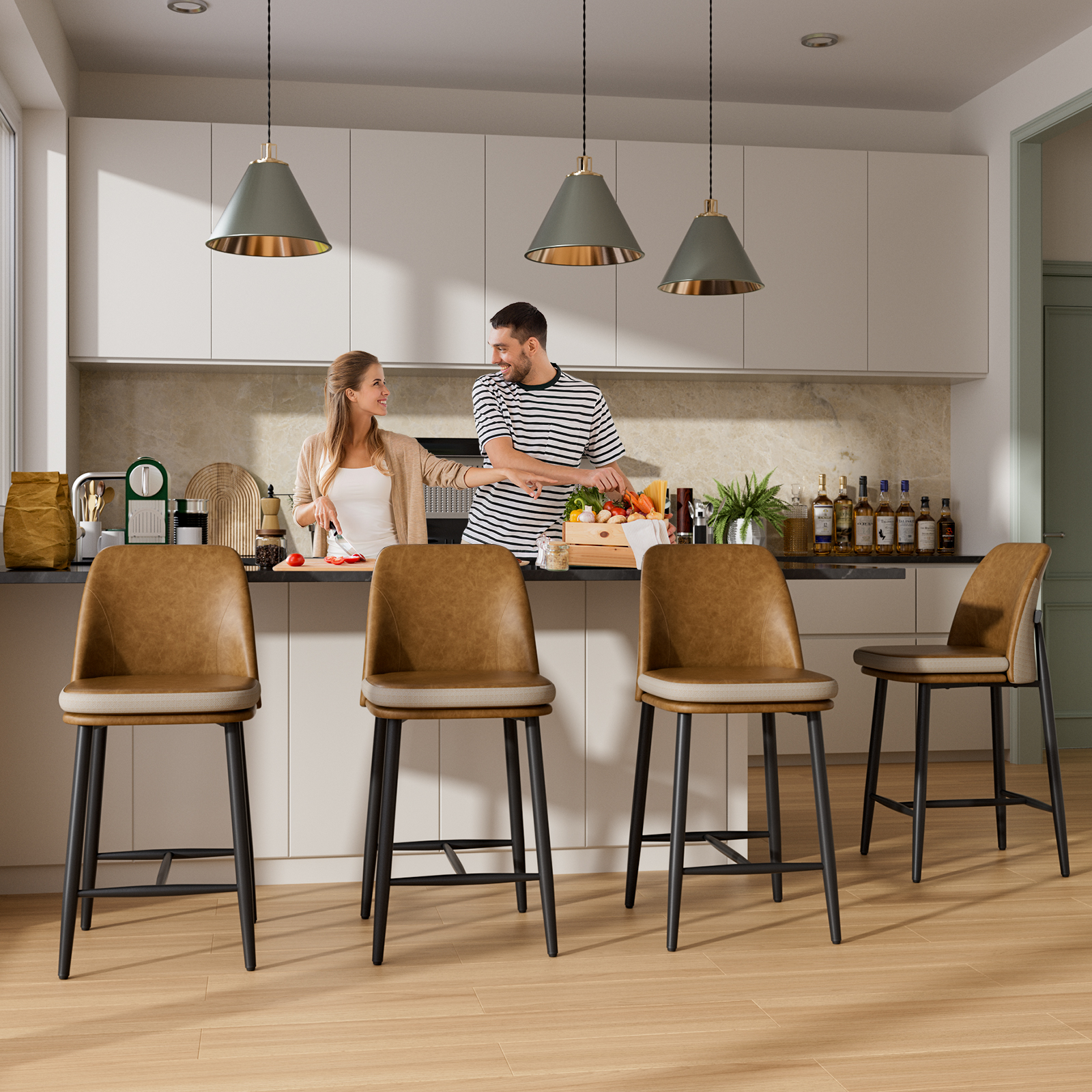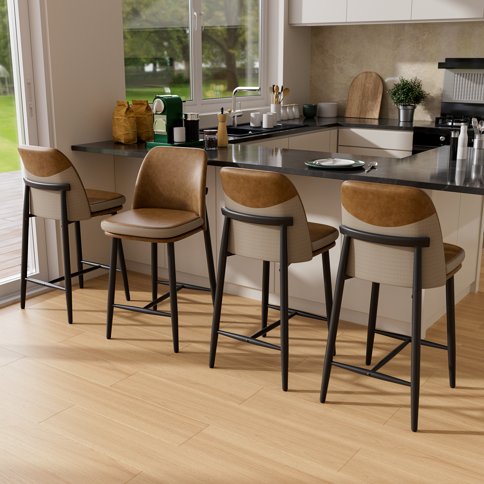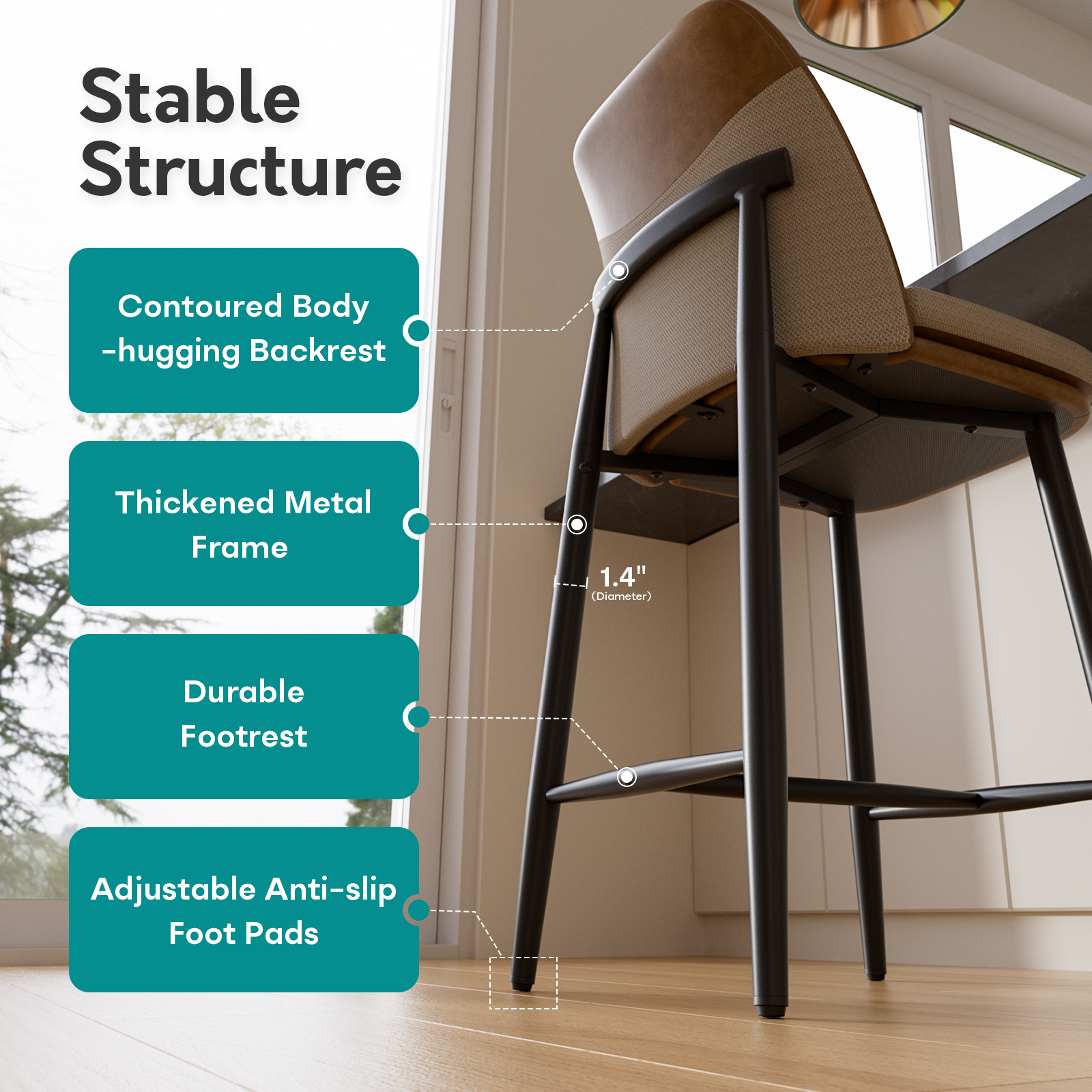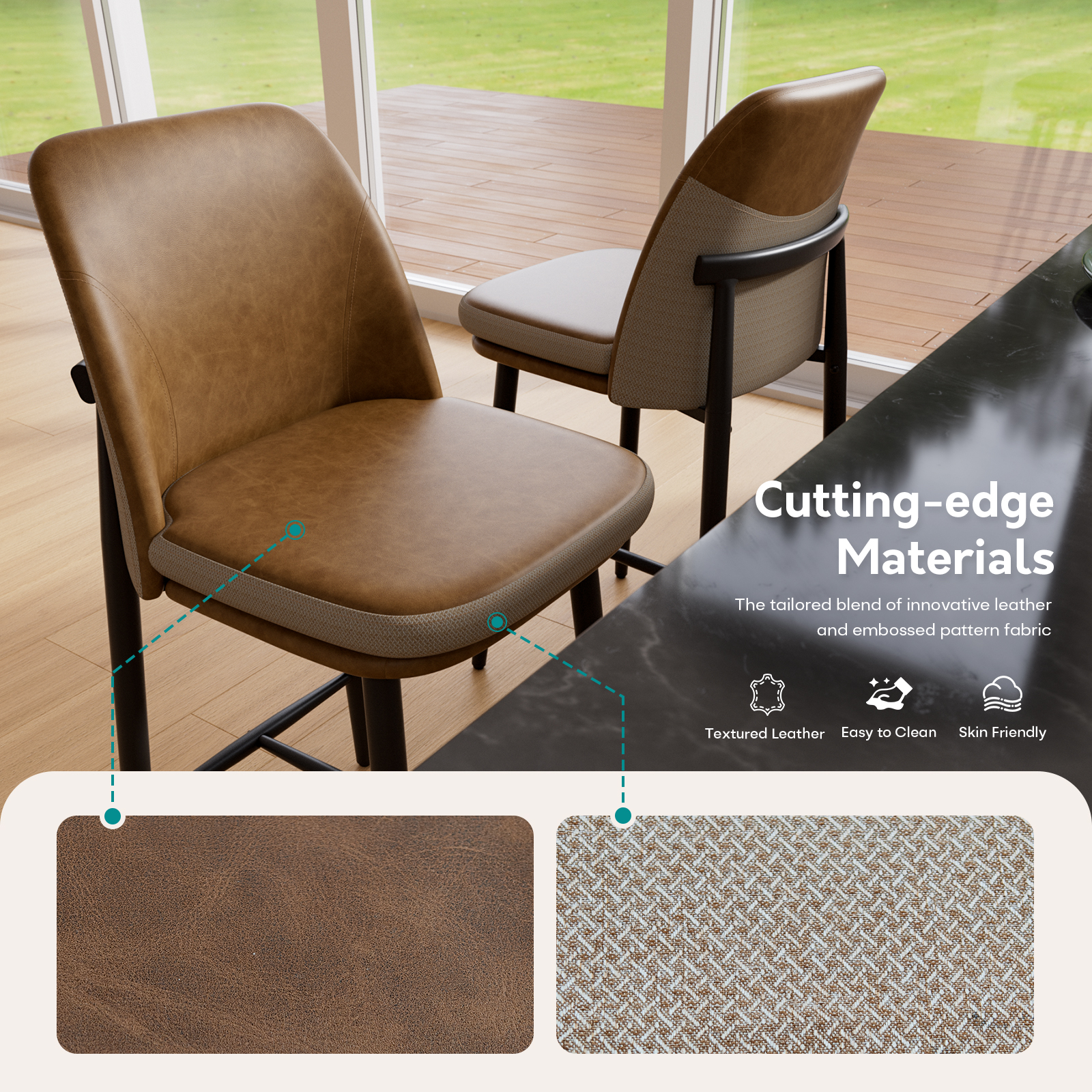 - Solfway counter stools set of 2 showcase a sophisticated dual-material construction. They combine the refined touch of high-end leather with the cozy warmth of textured fabric, seamlessly marrying elevated style with everyday comfort for a modern home.