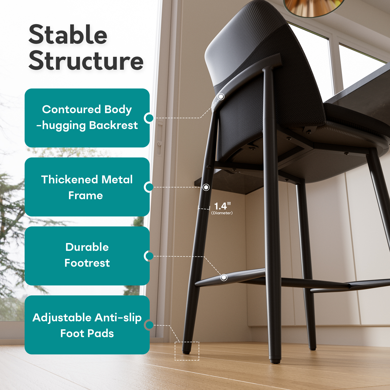 - Engineered with a thickened iron frame and 1.6″ widened legs, this barstools supports up to 350 lbs for safety. Adjustable anti-slip foot pads provide unwavering stability on uneven floors while protecting your flooring from scratches.