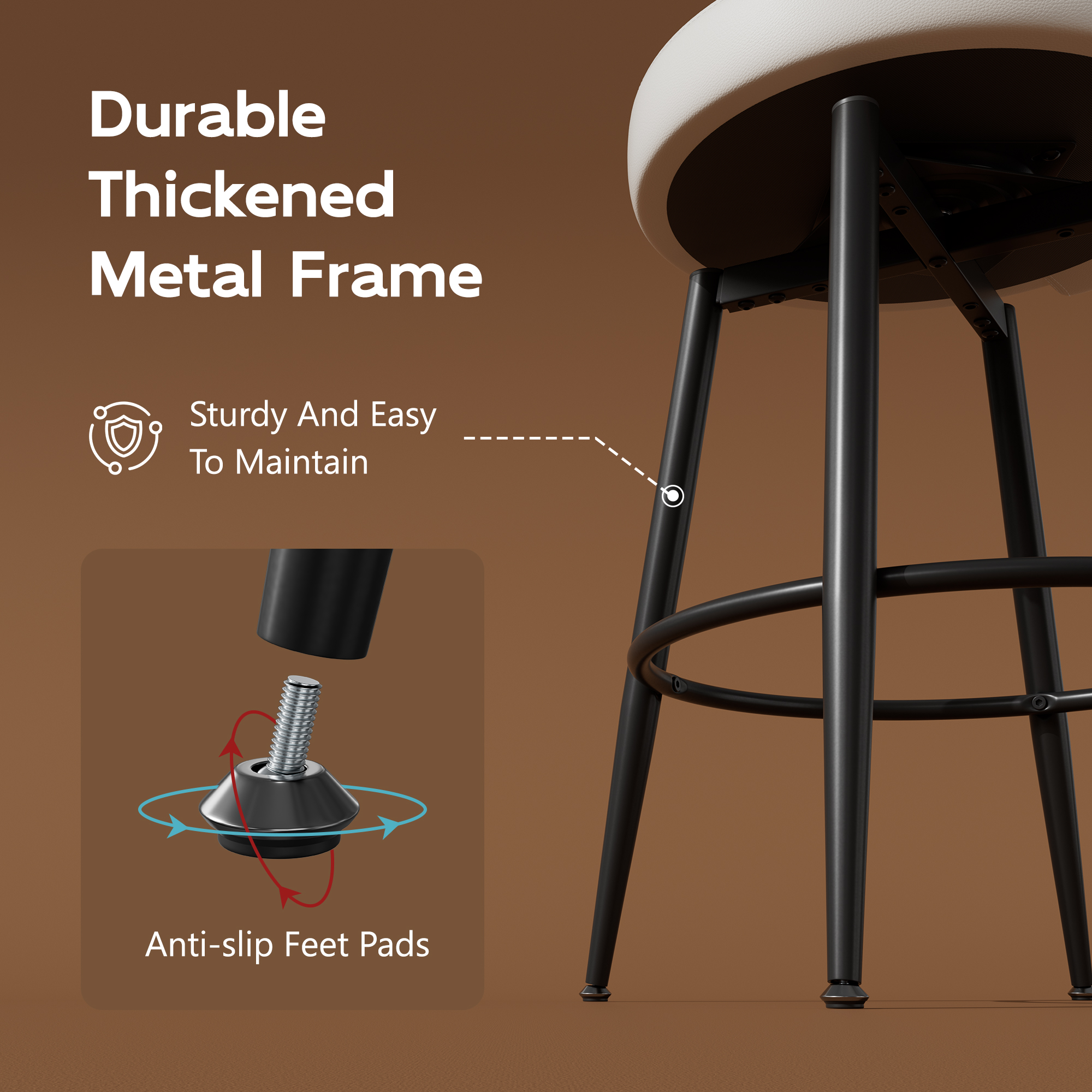 - 🍰Metal Kitchen Island Chairs: Kitchen bar stools with a sturdy metal base and anti-deformation design support up to 300 lbs; Footrest protrudes 0.8 inches for comfortable foot relaxation; Adjustable protective pads ensure stability on uneven floors