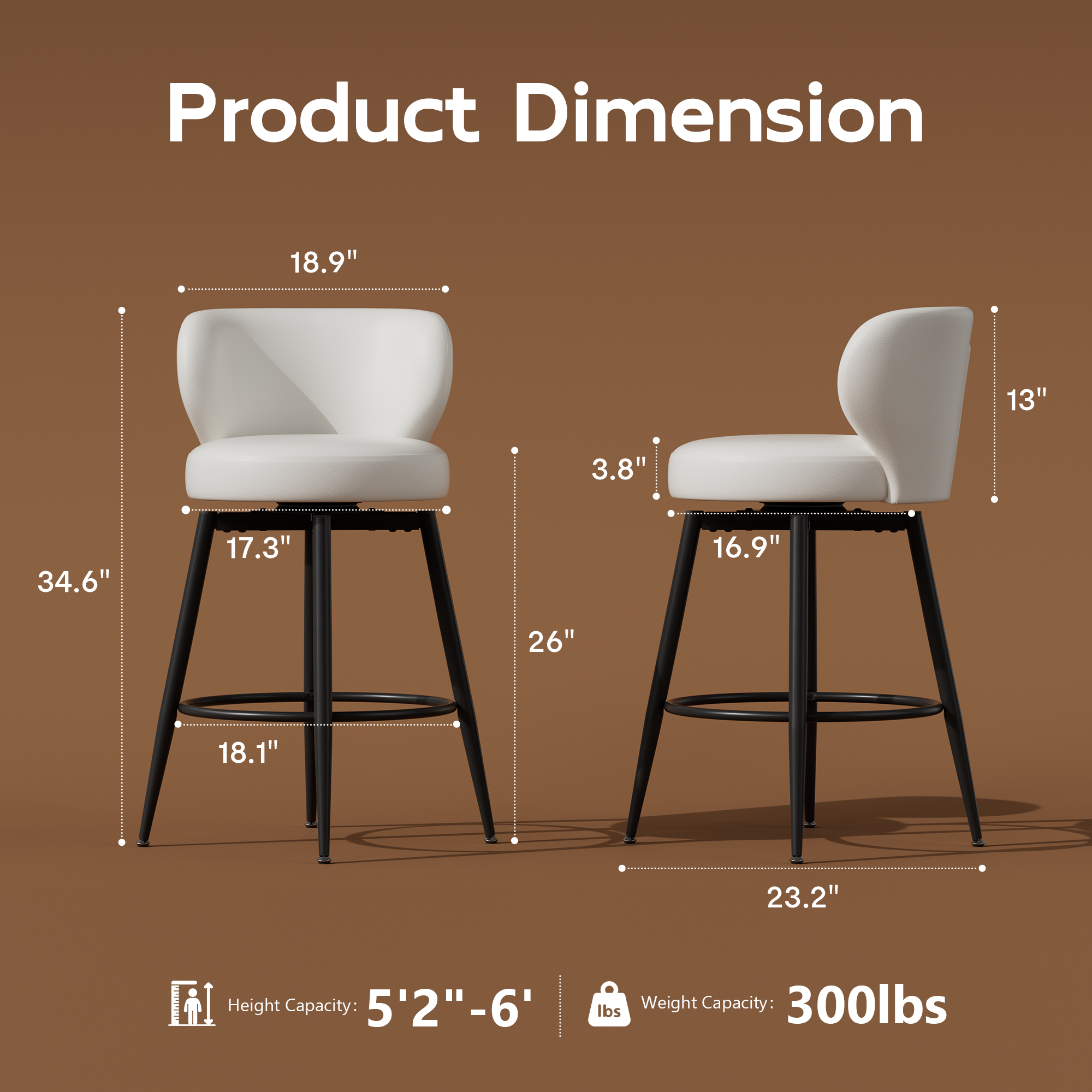 - 🌈Wider Counter Bar stools: Black bar stool set of 2 with wider seat cushion and backrest for a comfortable experience, ideal for those with a fuller figure; Overall Dimensions: 23.2 W x 23.2 D x 34.6 H inches; Seat Size: 17.3 W x 16.9 D inches; Seat Height: 26 inches; Weight Capacity: 300 lbs