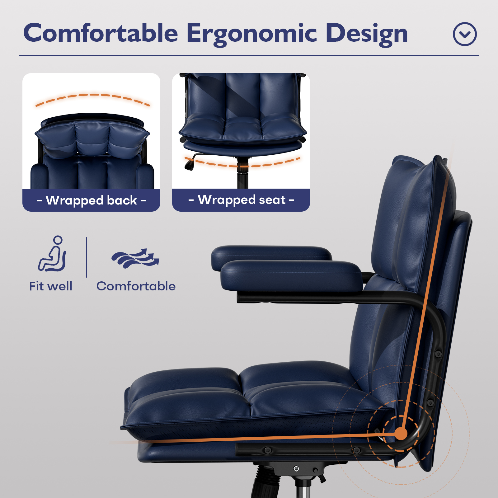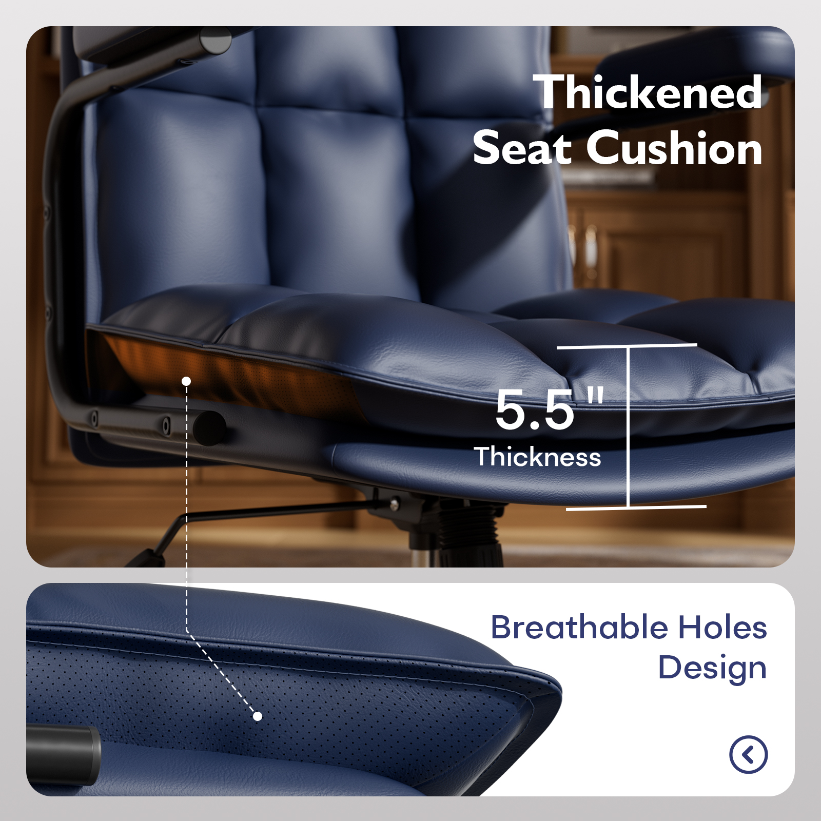 - 🥑Extra Thick Cushion & Breathable Comfort: Built for long hours of sitting. The seat and backrest of the desk chair are filled with plush, high density foam to relieve pressure on your hips and thighs. The ergonomically contoured back provides natural lumbar support, while side perforations enhance airflow, keeping you cool and comfortable all day