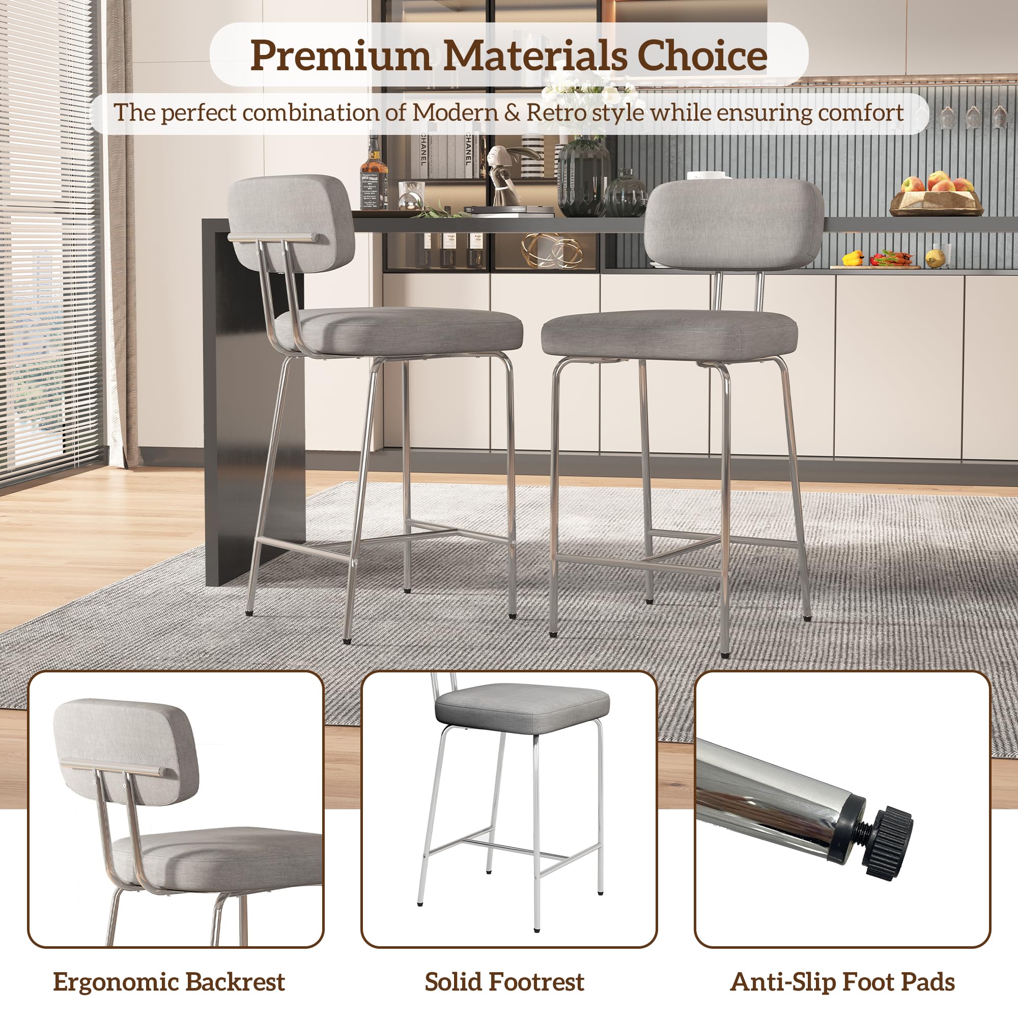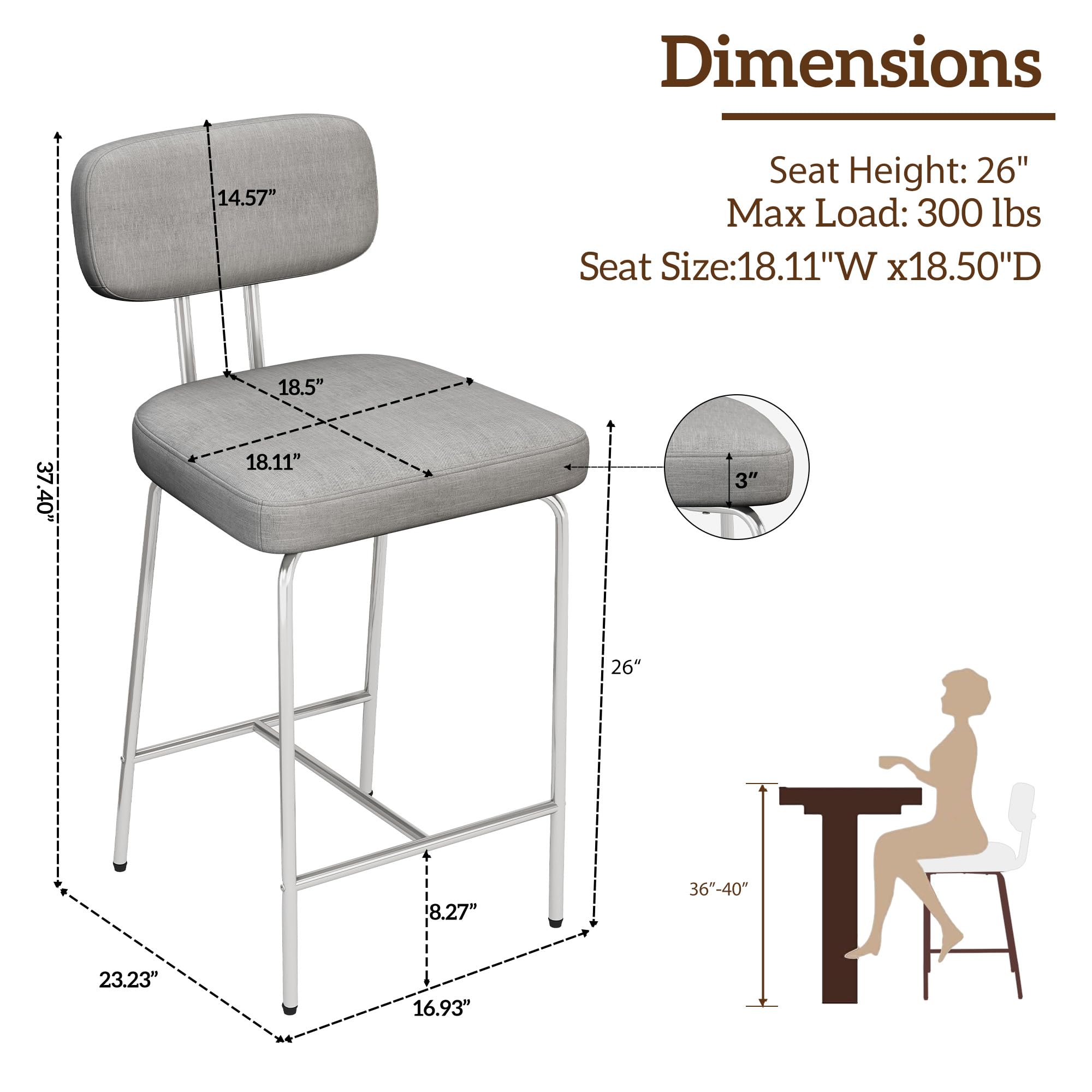 Solfway Counter Height Bar Stools Set of 2, 26″ Gray Fabric Kitchen Counter Stools with Backs, Metal Legs, Footrest and Wide Seat, Bar Chairs for Kitchen Island
