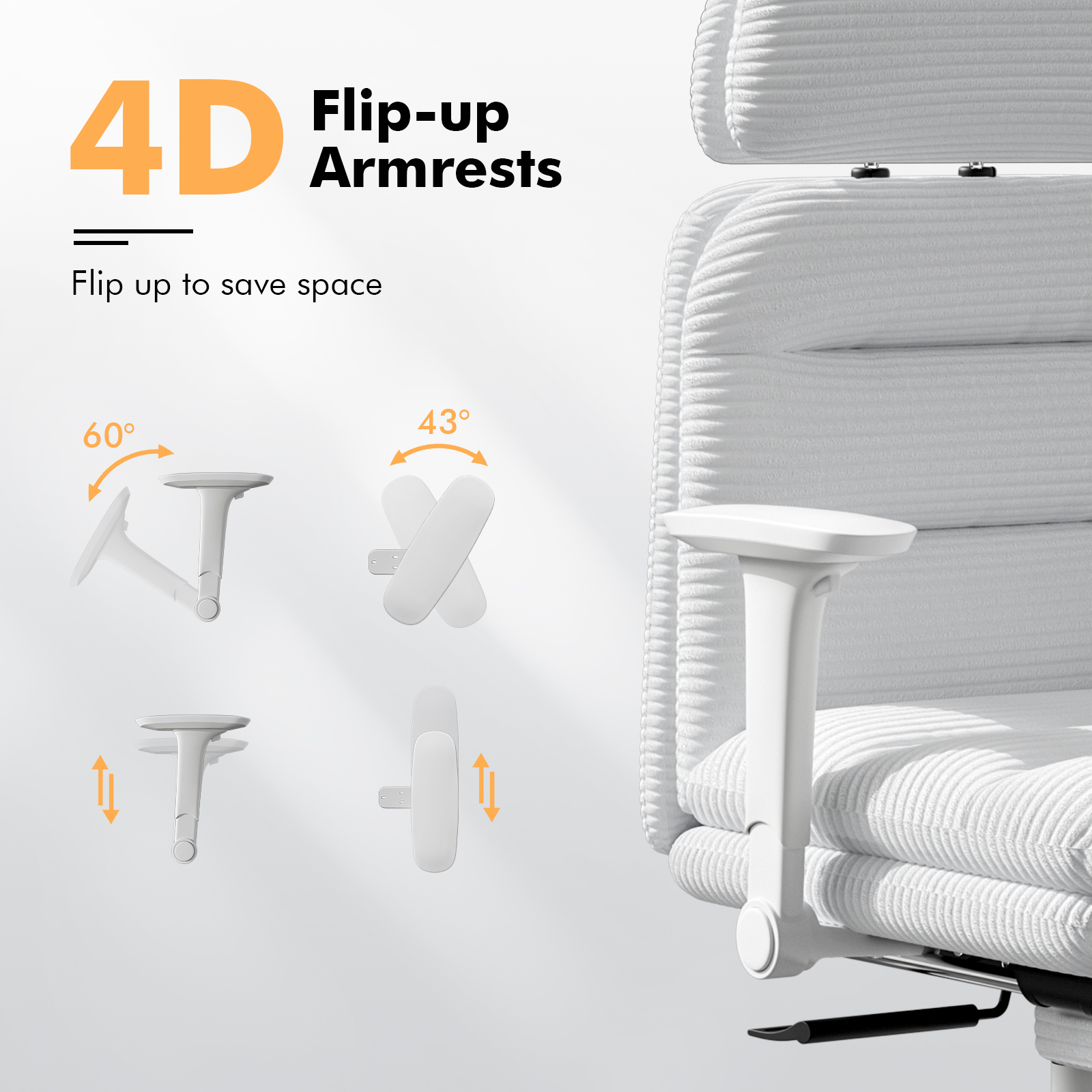 - 🚀Space-Saving 4D Flip-Up Armrests: 60° flip-up armrests enable cross-legged sitting and easy desk storage. 4D adjustable armrests (height/slide/rotation) offer customization arm support and ergonomic positioning.