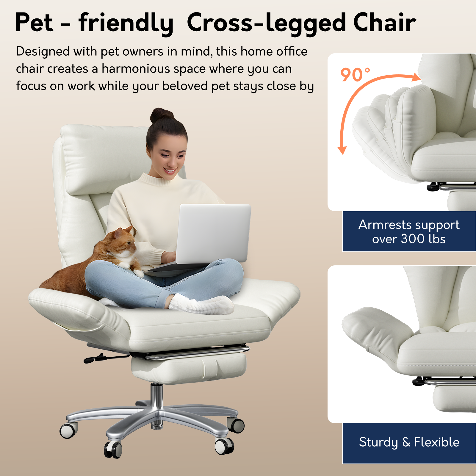 Solfway Criss Cross Desk Chair, Cross Legged Office Chair with Wheels, White Leather Big and Tall Reclining Office Chair 500lbs with Foot Rest, Reversible Armrests & Wide Seat