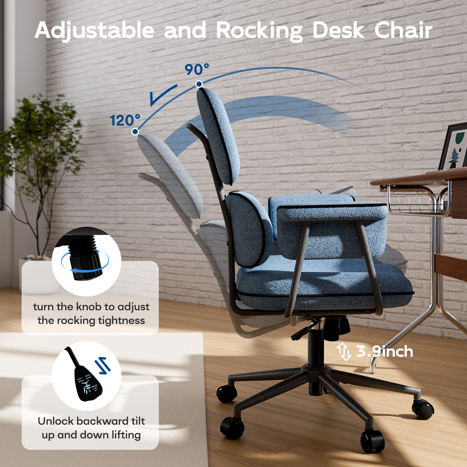 ✓ 90°-120° reclining backrest with 3-angle locking