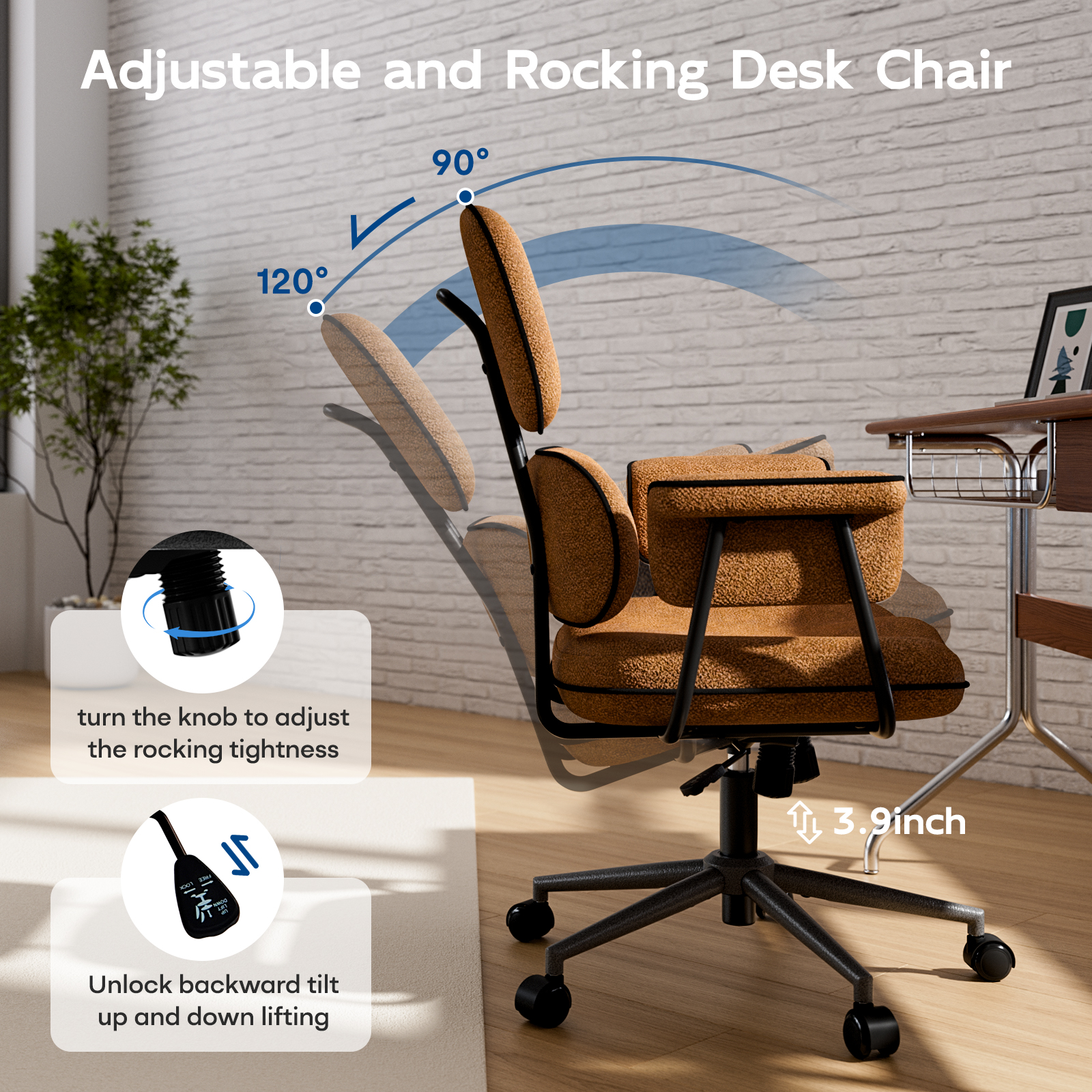 ✓ 90°-120° reclining backrest with 3-angle locking