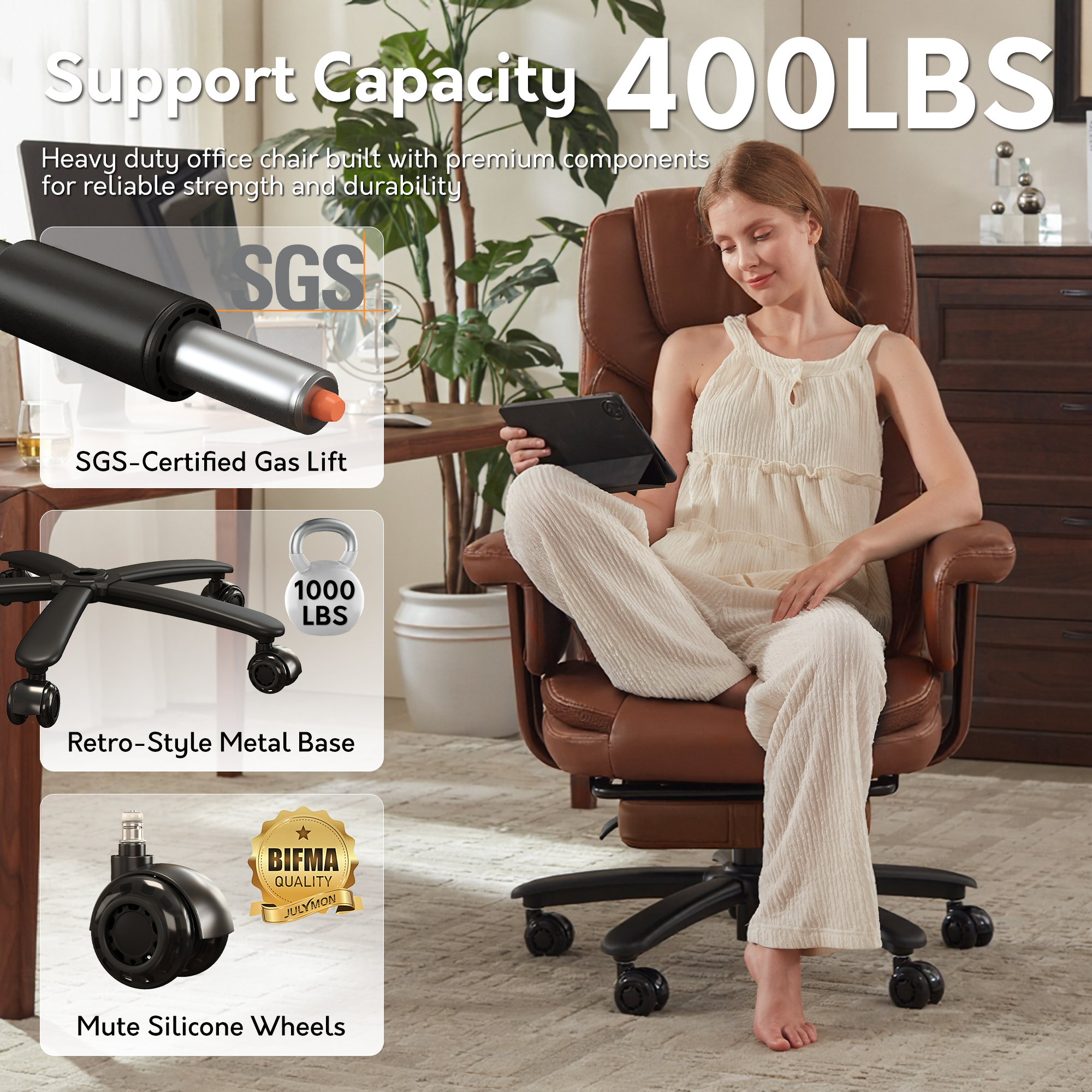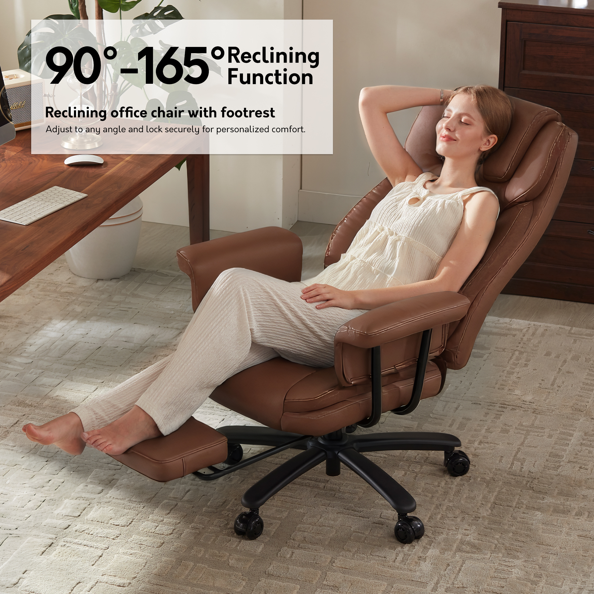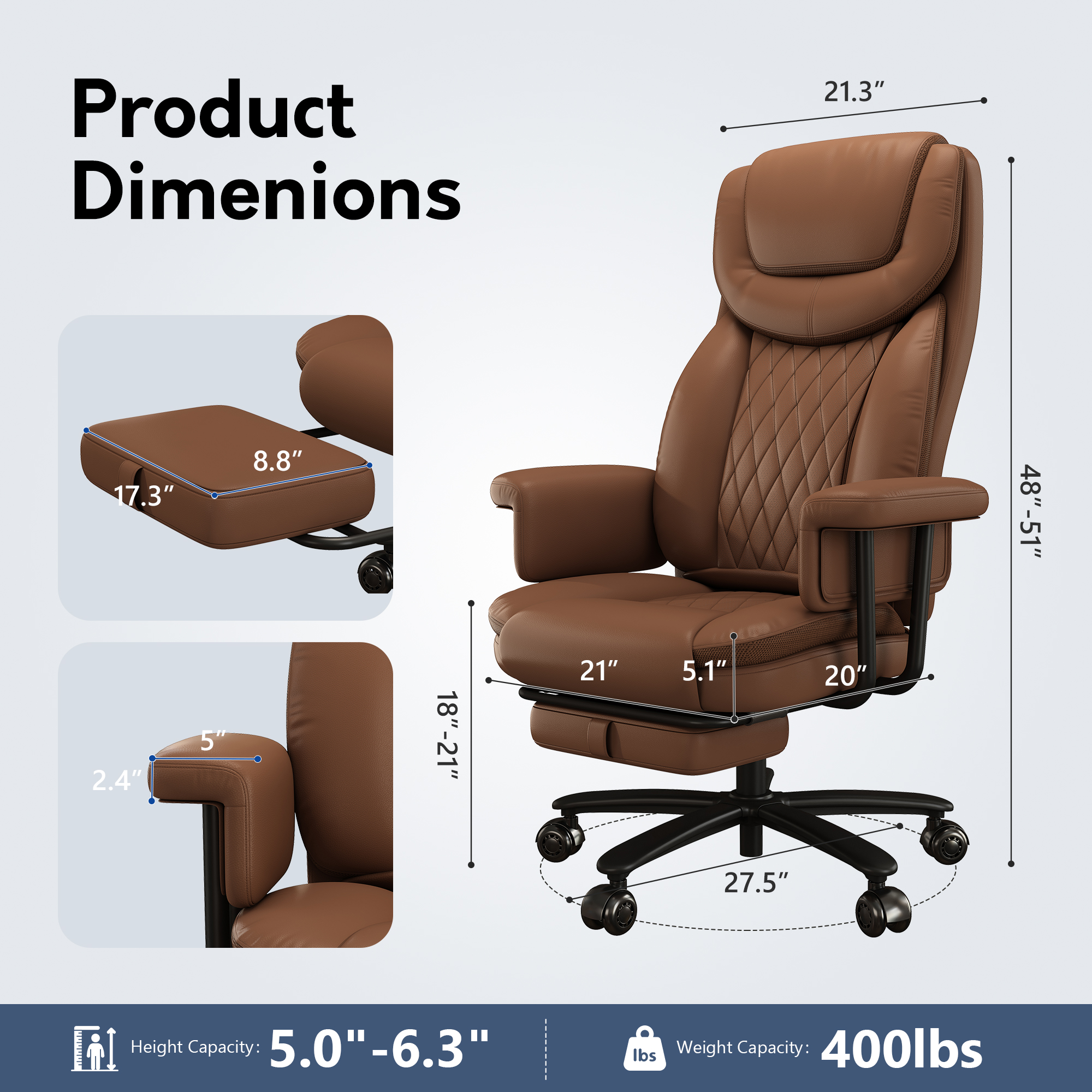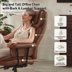 Genpo Reclining Office Chair Big and Tall 400LBS, Executive Office Chair with Footrest, Brown Leather Computer Desk Chair with Quiet Wheels, Height Adjustable And Padded Arms