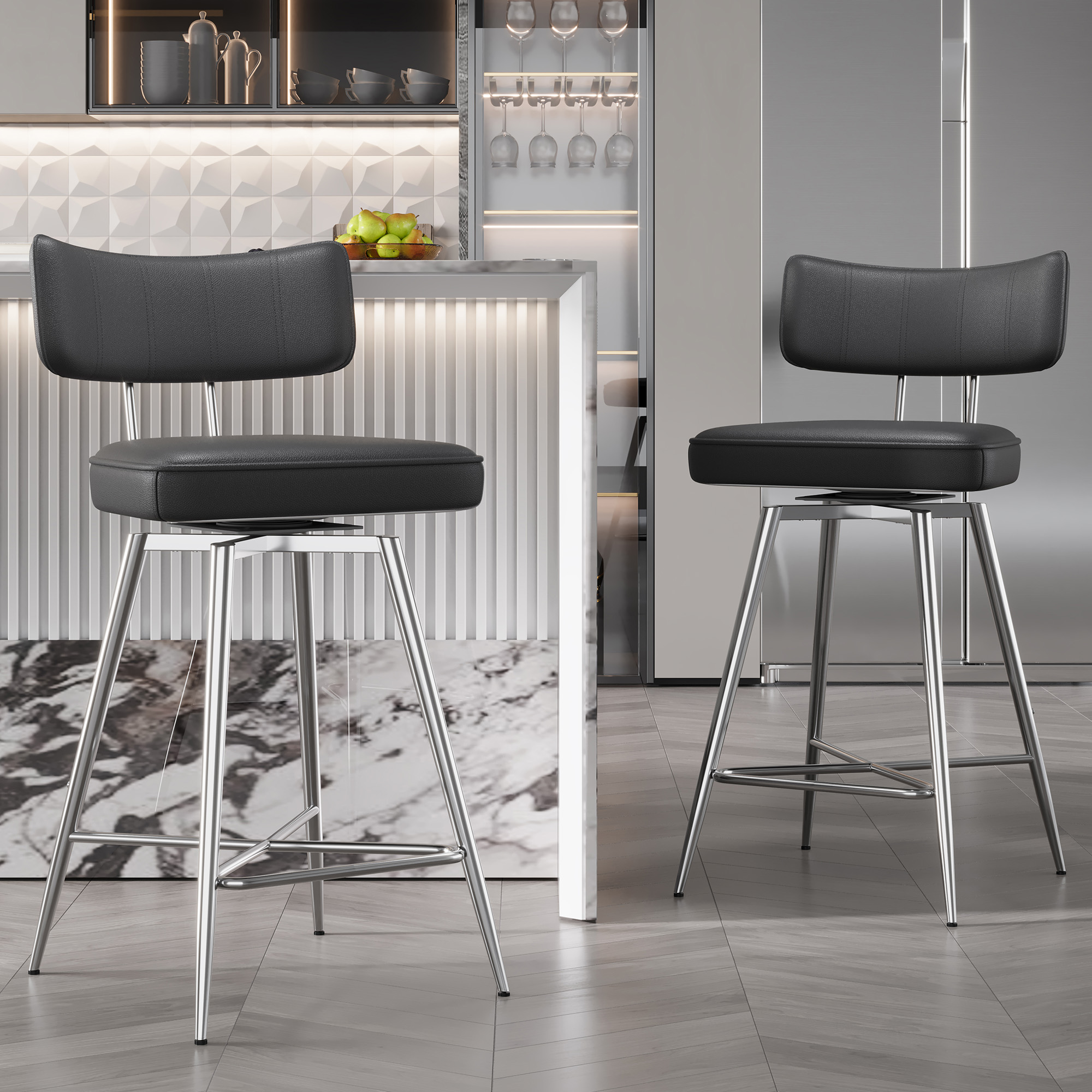 Our chic and comfortable barstools is with an elegantly curved backrest and plush upholstered seat, these counter height stools offer both style and support. The unique footrest design and anti-slip pads ensure stability, while the 360-degree swivel feature adds modern versatility. Elevate your space with these stylish bar stools!