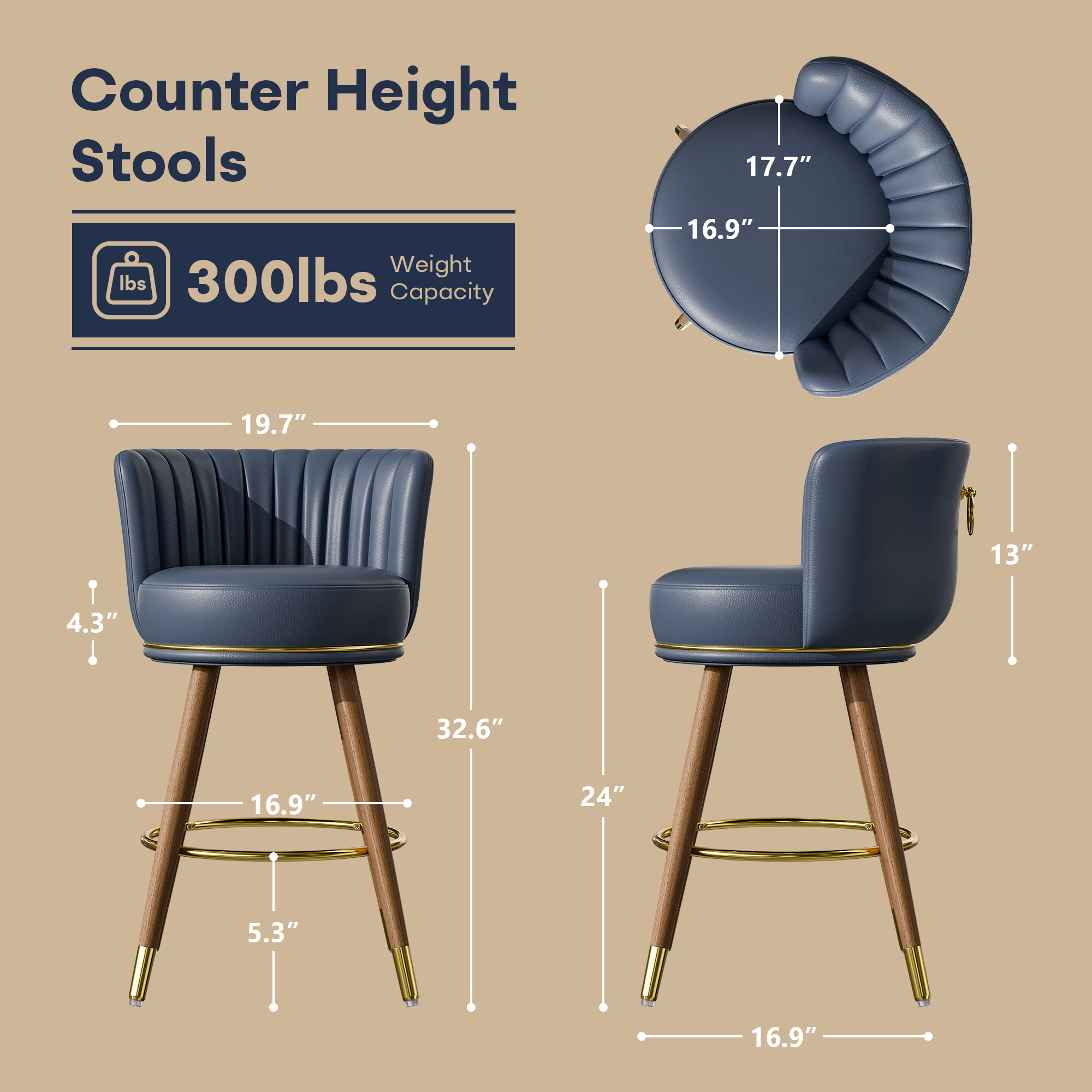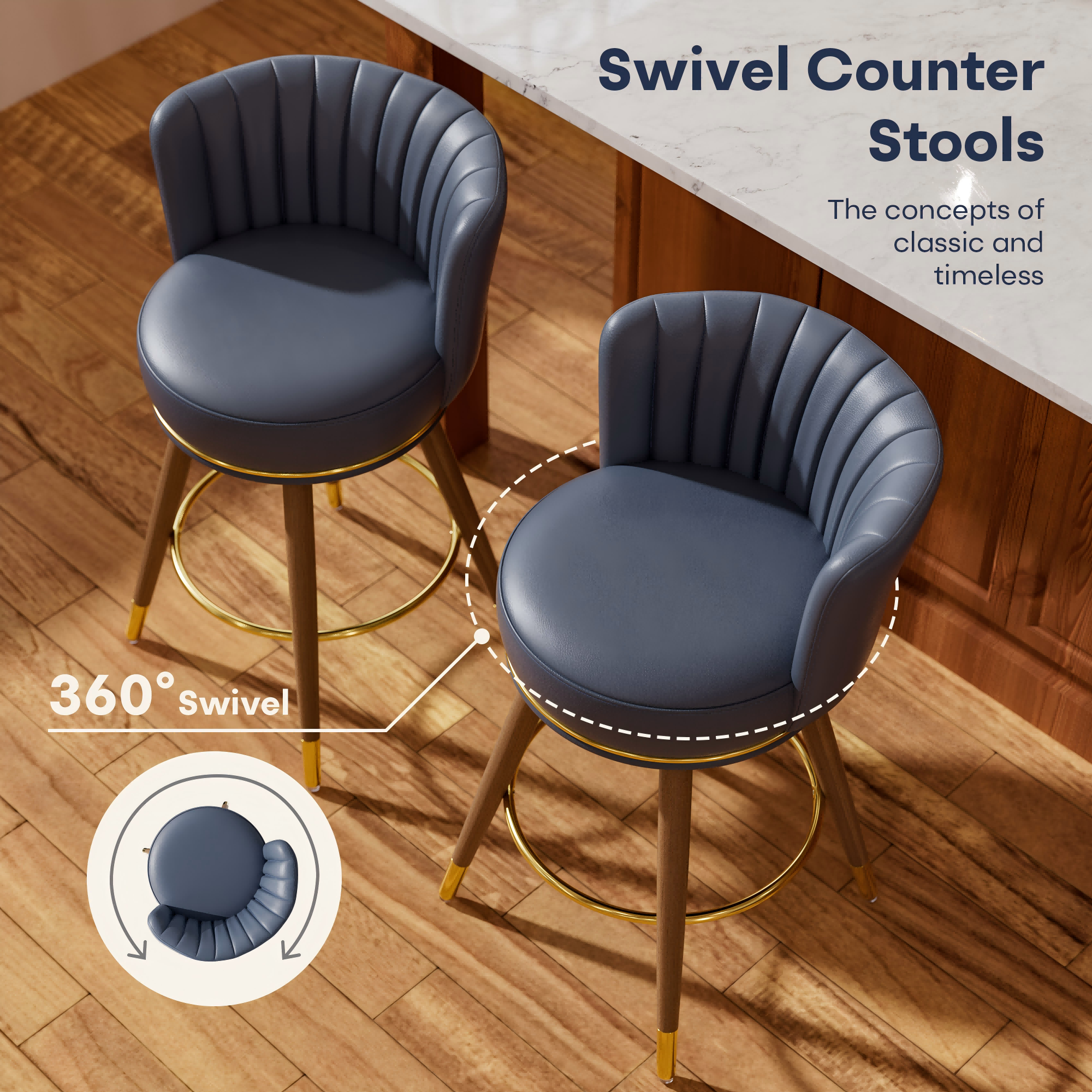 Solfway Swivel Counter Height Bar Stools Set of 4, 24 inch Blue Leather Kitchen Swivel Counter Stools with Backs, Metal Legs and Footrest, Bar Chairs for Kitchen Island
