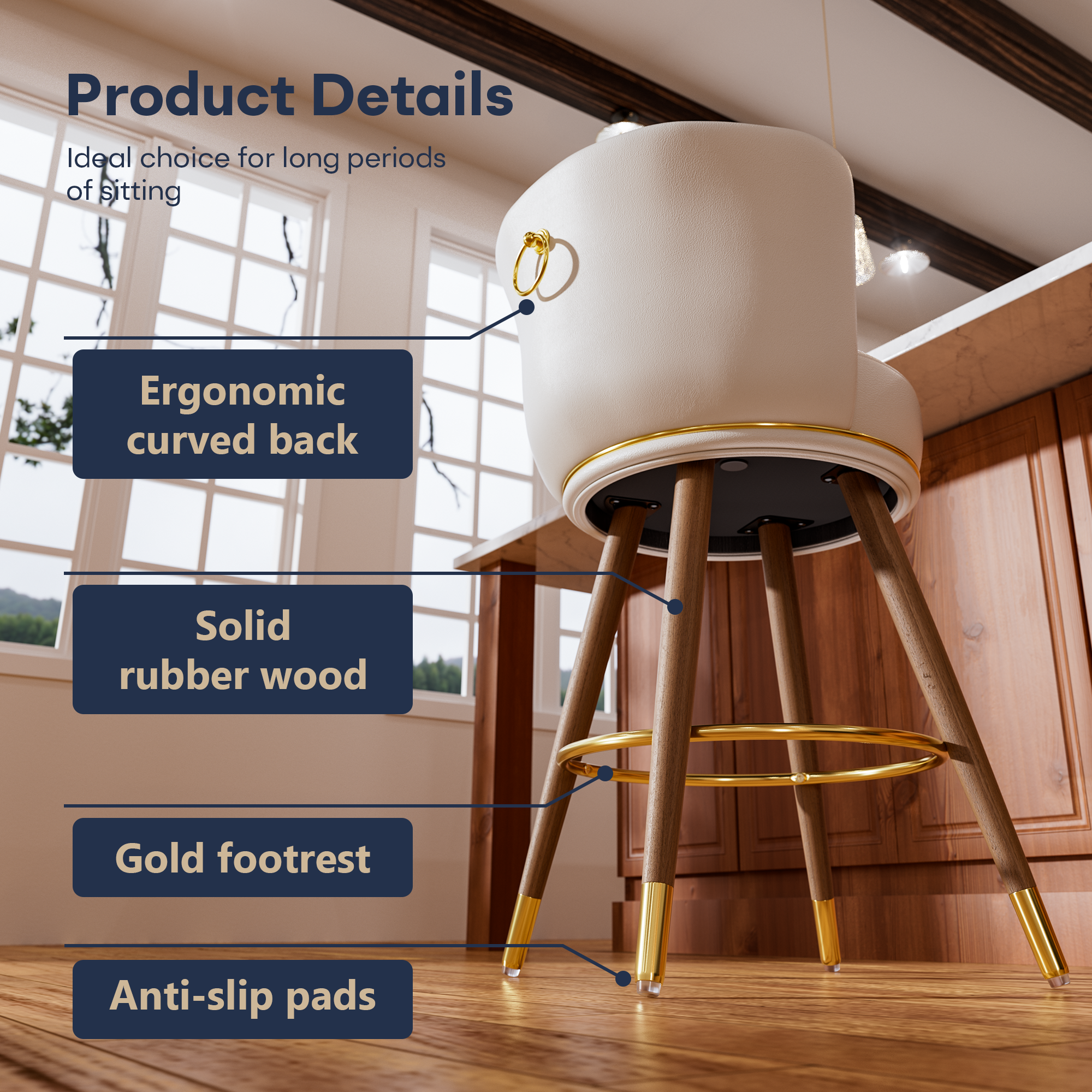 Solfway Swivel Counter Height Bar Stools Set of 4, 24 inch White Leather Kitchen Swivel Counter Stools with Backs, Wood Legs and Footrest, Bar Chairs for Kitchen Island
